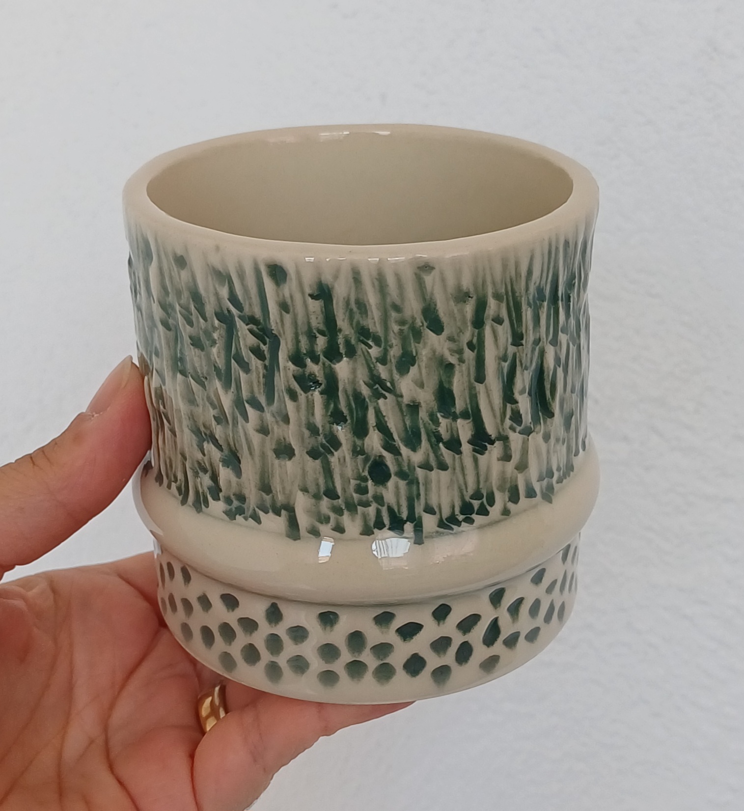 Copo Argola #1 17,50 € Desconto de %. Partilhar Comprar Contactar Disponível para entrega imediata e enviado em até 2 dias úteis após a encomenda. Características: 100% Feito à Mão. Material: Grés com vidrado apropriado para microondas e lava-loiça. Categoria: Utilitário e/ou Decorativo. Cores: Verde com fundo Creme. Altura Aprox. 8,4cm Diâmetro Aprox. 9cm
