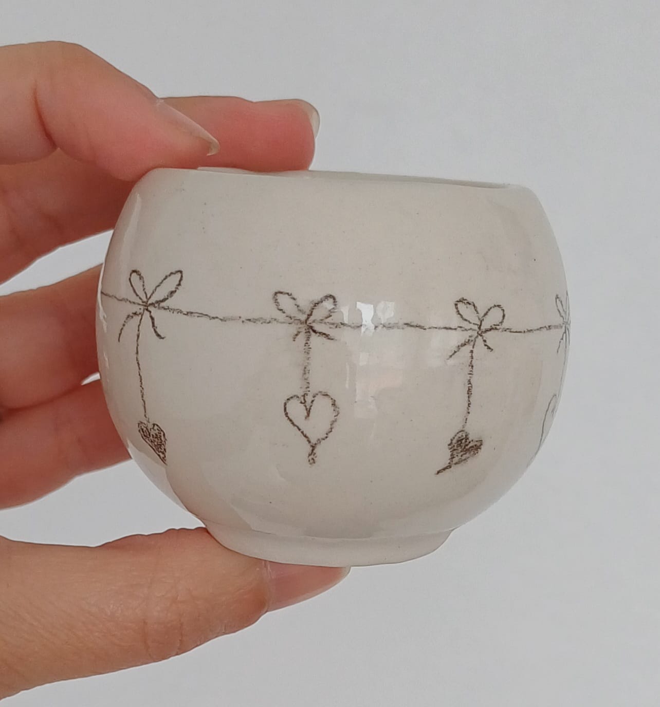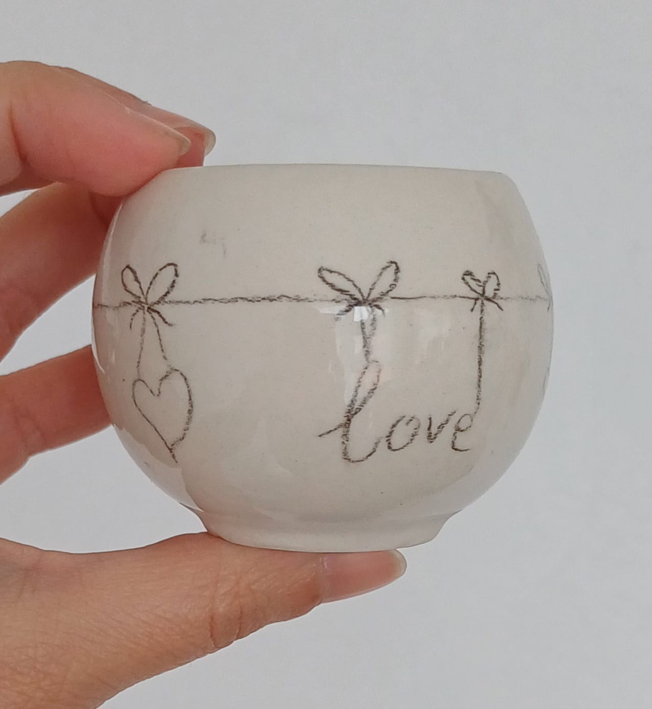 Copo Bola Pequena #1 9,00 € Desconto de %. Partilhar Comprar Contactar Disponível para entrega imediata e enviado em até 2 dias úteis após a encomenda. Características: 100% Feito à Mão. Material: Grés com vidrado apropriado para microondas e lava-loiça. Categoria: Utilitário. Cores: Creme com desenhos a lápis cerâmico. Altura Aprox. 6cm Diâmetro Aprox. 5cm