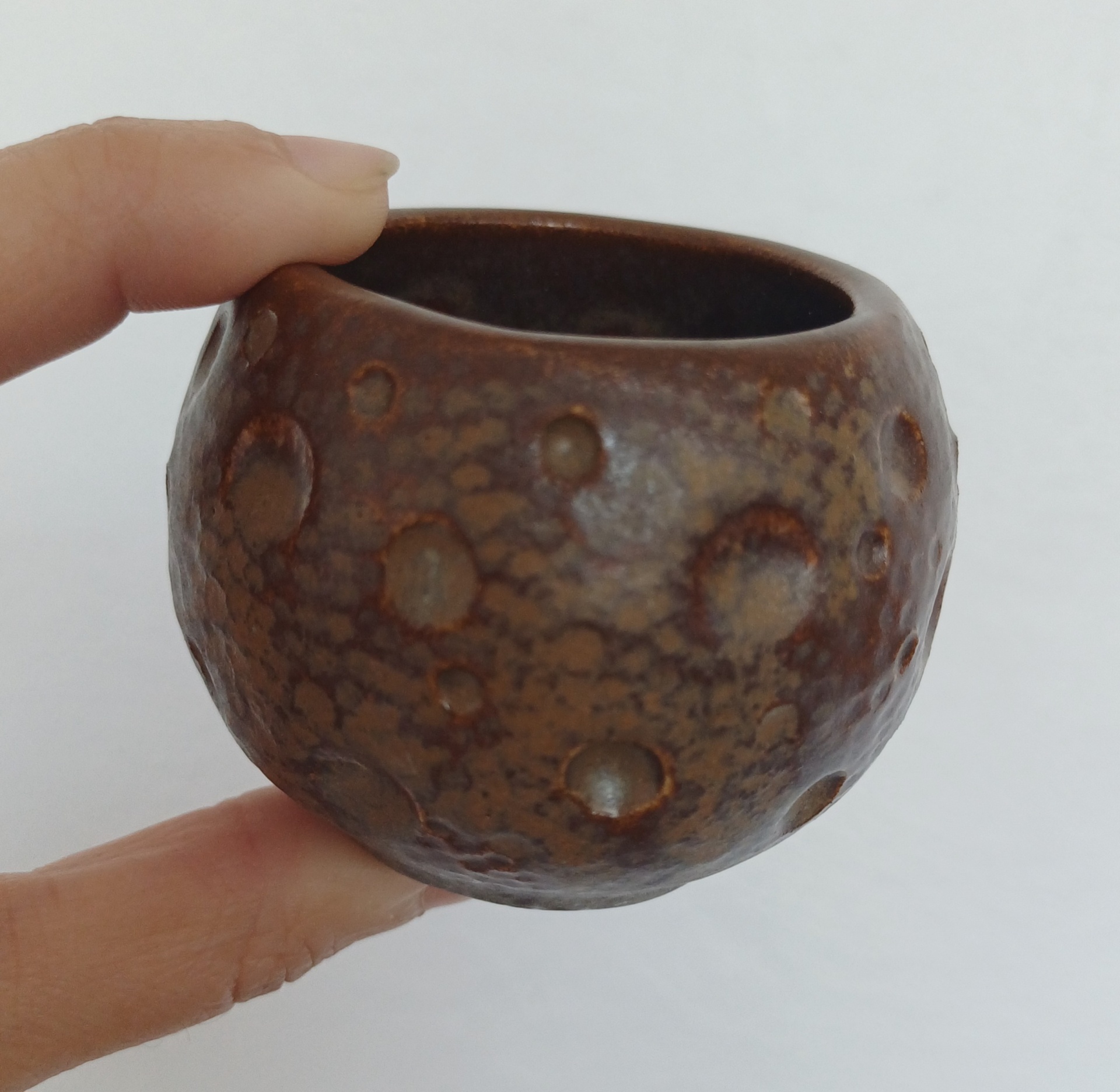 Copo Bola Pequena #3 7,00 € Desconto de %. Partilhar Textura Bolas Riscas Comprar Contactar Disponível para entrega imediata e enviado em até 2 dias úteis após a encomenda. Características: 100% Feito à Mão. Material: Grés com vidrado apropriado para microondas e lava-loiça. Categoria: Utilitário. Cores: Castanho. Altura Aprox. 6cm Diâmetro Aprox. 5cm
