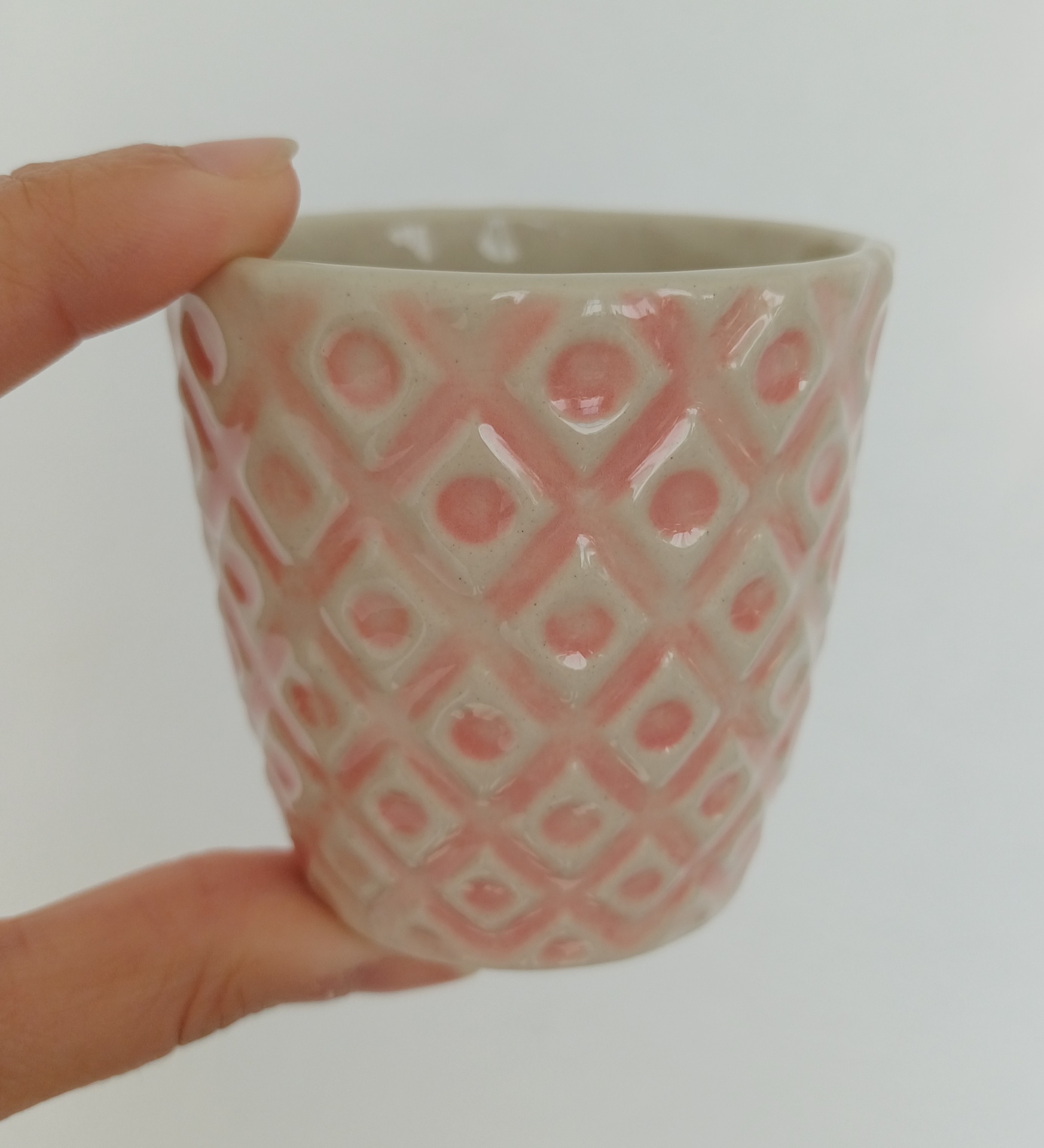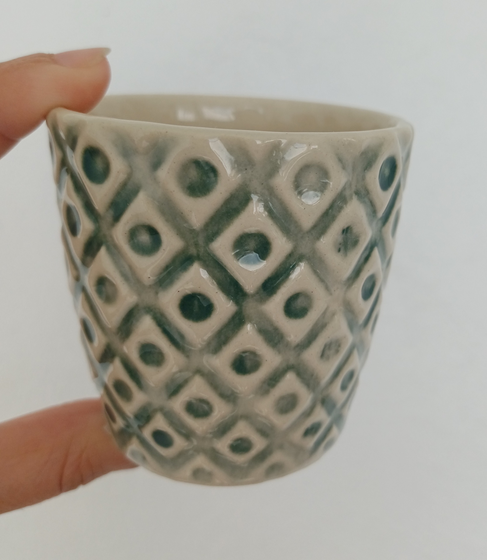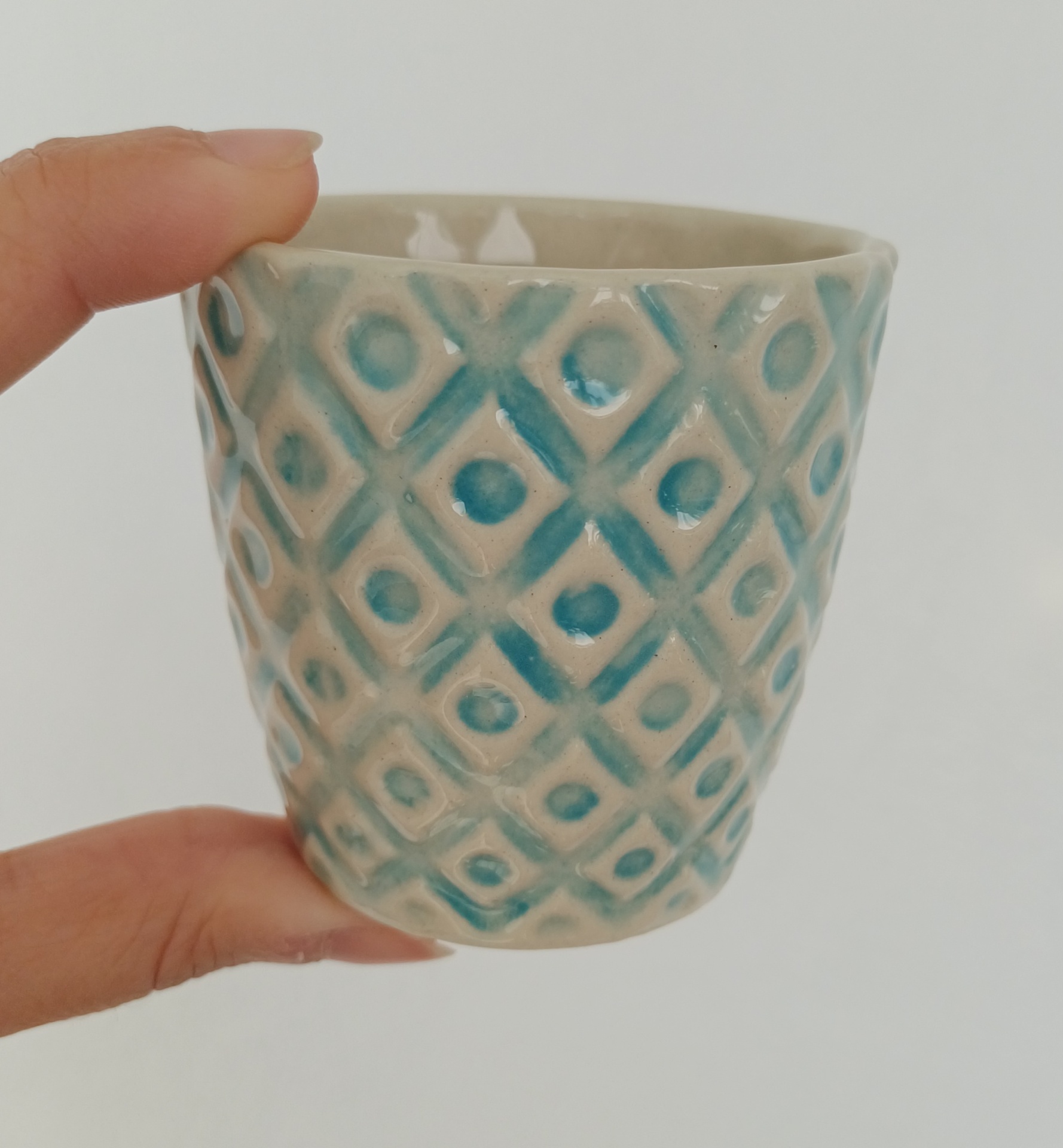 Copo de Café #2 9,40 € Desconto de %. Partilhar Cor Pormenor Amarelo Pormenor Castanho Pormenor Vermelho Pormenor Rosa Pormenor Laranja Pormenor Azul Pormenor Turquesa Pormenor Verde Comprar Contactar Disponível para entrega imediata e enviado em até 2 dias úteis após a encomenda. Características: 100% Feito à Mão. Material: Grés com vidrado apropriado para microondas e lava-loiça. Categoria: Utilitário. Cores: Disponível em várias cores. Altura Aprox. 6cm Diâmetro Aprox. 6,5cm