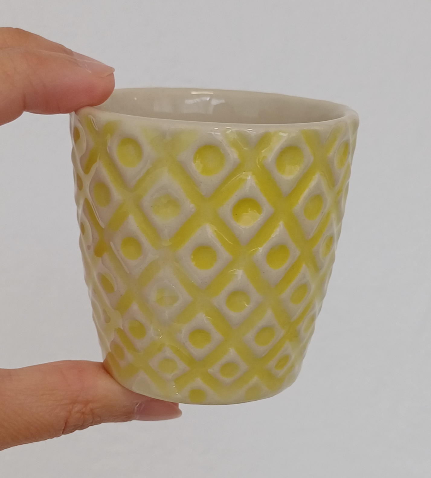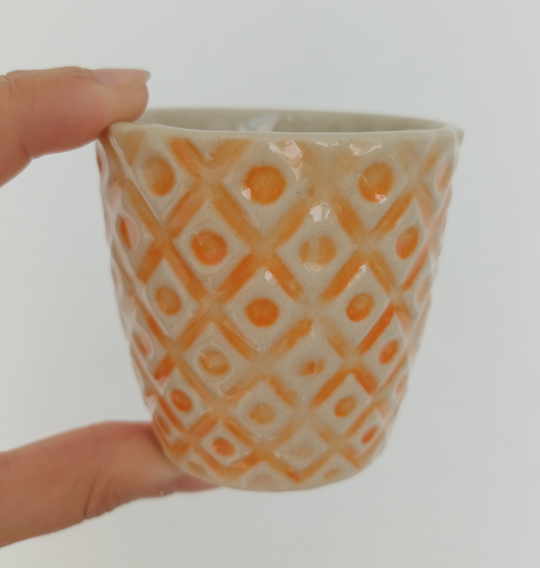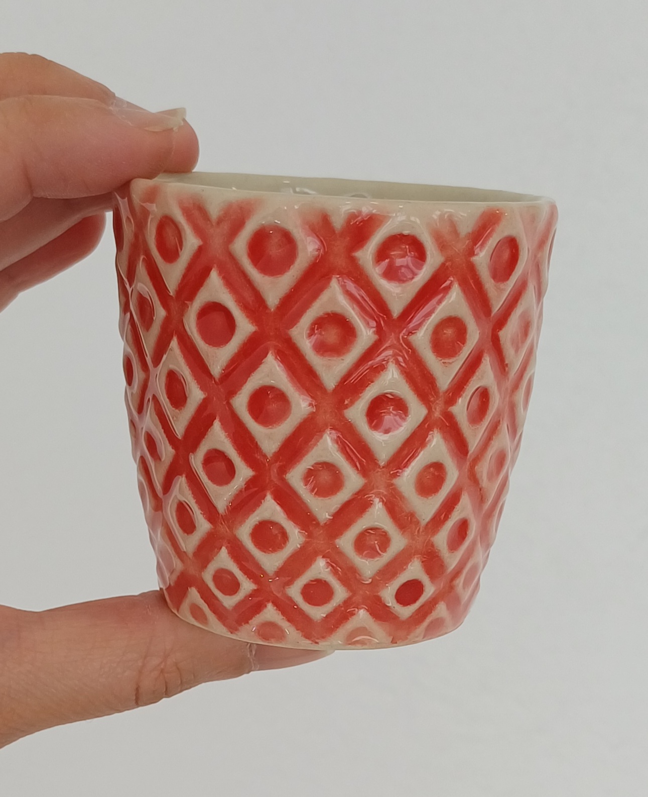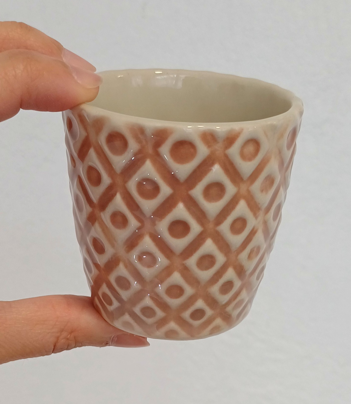 Copo de Café #2 9,40 € Desconto de %. Partilhar Cor Pormenor Amarelo Pormenor Castanho Pormenor Vermelho Pormenor Rosa Pormenor Laranja Pormenor Azul Pormenor Turquesa Pormenor Verde Comprar Contactar Disponível para entrega imediata e enviado em até 2 dias úteis após a encomenda. Características: 100% Feito à Mão. Material: Grés com vidrado apropriado para microondas e lava-loiça. Categoria: Utilitário. Cores: Disponível em várias cores. Altura Aprox. 6cm Diâmetro Aprox. 6,5cm