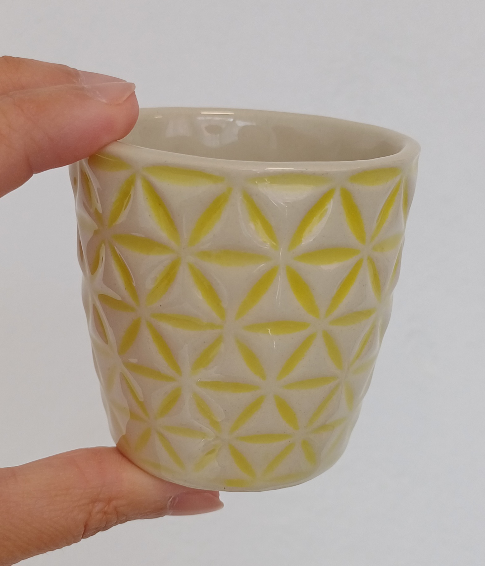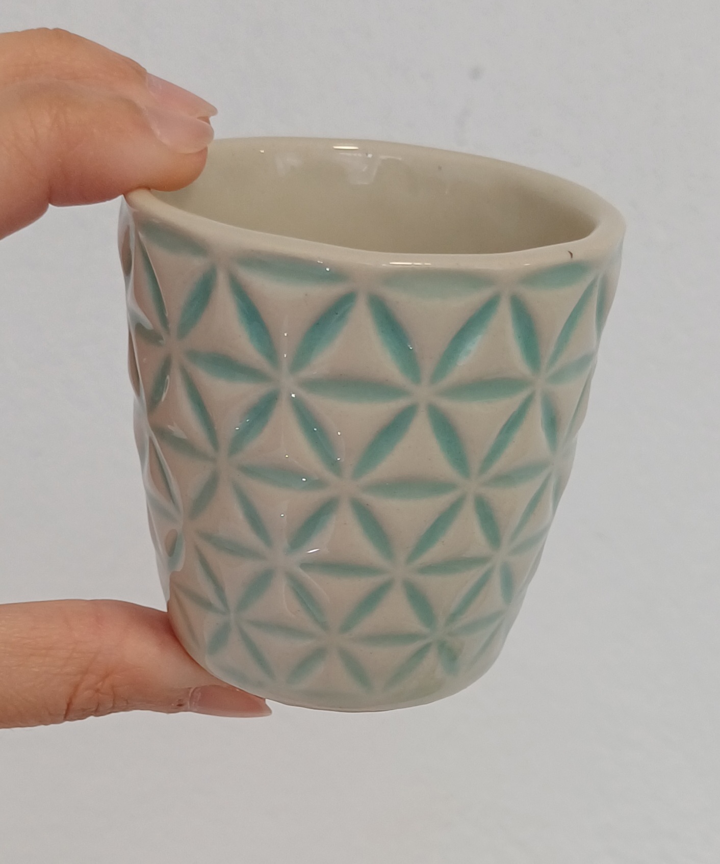 Copo de Café #5 9,40 € Desconto de %. Partilhar Cor Pormenor Verde Água Pormenor Amarelo Pormenor Vermelho Pormenor Azul Comprar Contactar Disponível para entrega imediata e enviado em até 2 dias úteis após a encomenda. Características: 100% Feito à Mão. Material: Grés com vidrado apropriado para microondas e lava-loiça. Categoria: Utilitário. Cores: Disponível em várias cores. Altura Aprox. 6cm Diâmetro Aprox. 6,5cm