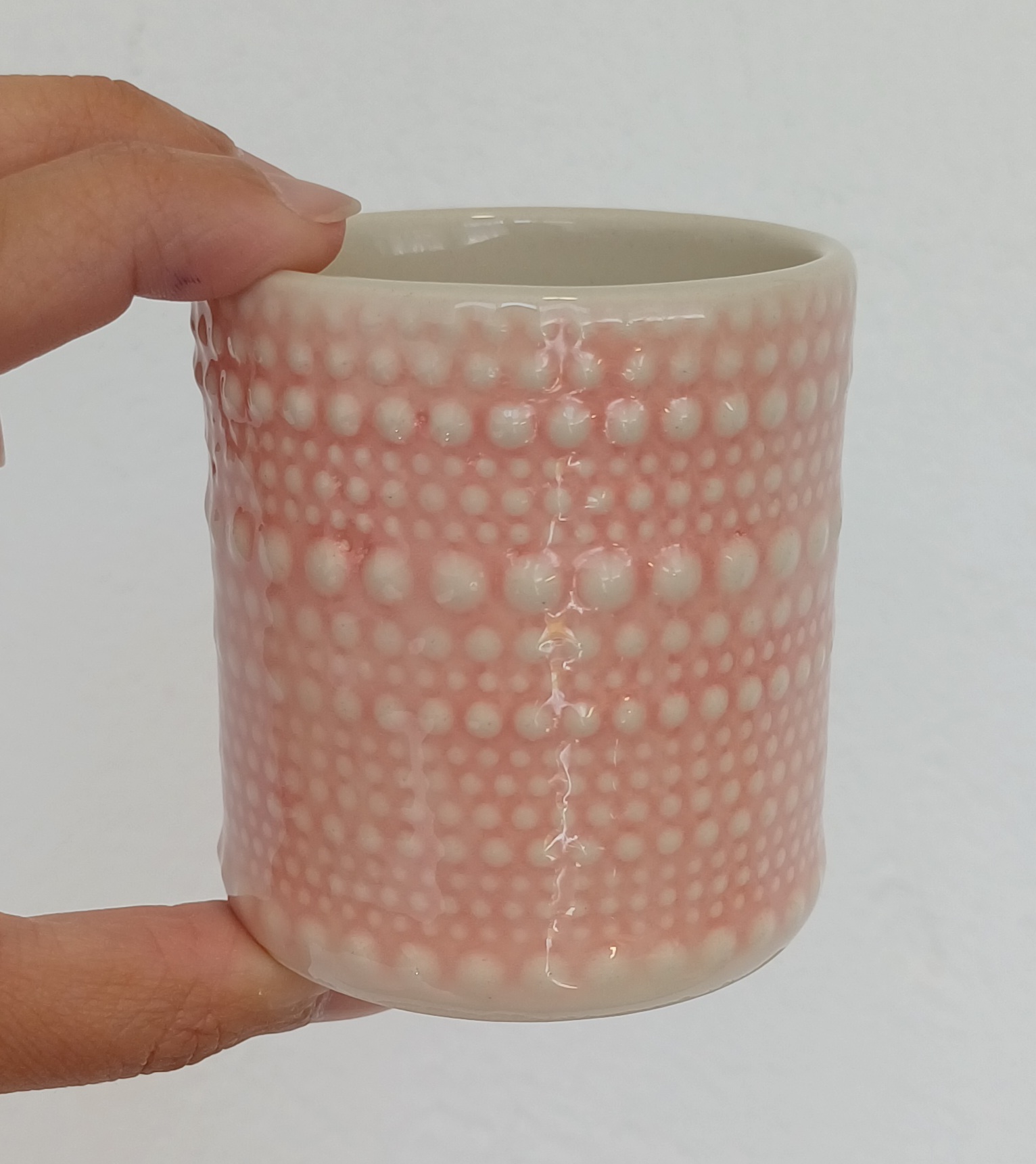 Copo de Café #7 9,40 € Desconto de %. Partilhar Comprar Contactar Disponível para entrega imediata e enviado em até 2 dias úteis após a encomenda. Características: 100% Feito à Mão. Material: Grés com vidrado apropriado para microondas e lava-loiça. Categoria: Utilitário. Cores: Disponível em rosa. Altura Aprox. 7cm Diâmetro Aprox. 6,3cm