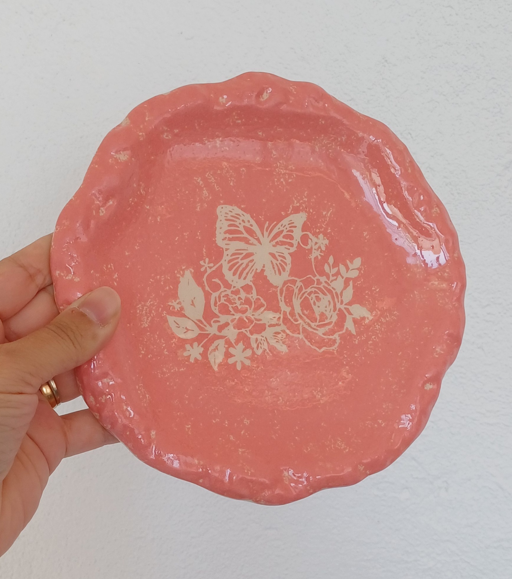 Prato Grande Rugoso #2 17,00 € Desconto de %. Partilhar Desenho Borboletas Comprar Contactar Disponível para entrega imediata e enviado em até 2 dias úteis após a encomenda. Características: 100% Feito à Mão. Material: Grés com vidrado apropriado para microondas e lava-loiça. Categoria: Utilitário. Cores: Disponível em várias cores. Altura Aprox. 1,2cm Diâmetro Aprox. 18,5cm