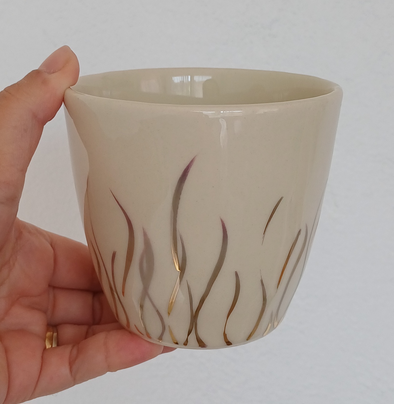 Vaso com Ouro 14,50 € Desconto de %. Partilhar Desenho Riscas Comprar Contactar Disponível para entrega imediata e enviado em até 2 dias úteis após a encomenda. Características: 100% Feito à Mão. Material: Grés com vidrado e ouro verdadeiro. Categoria: Decorativo. Cores: Ouro com fundo Creme. Altura Aprox. 9cm Diâmetro Aprox. 10cm